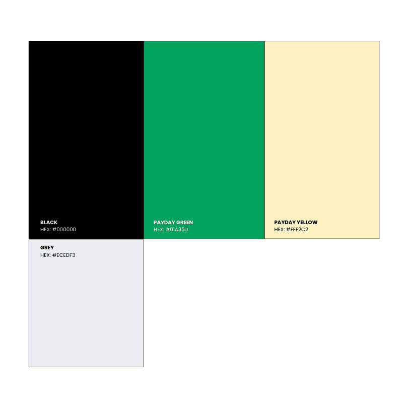 Our chosen fonts are bold and clear, embodying Payday’s direct and reliable nature. The typography is designed to enhance readability and provide a professional, welcoming experience for users navigating our platform.
